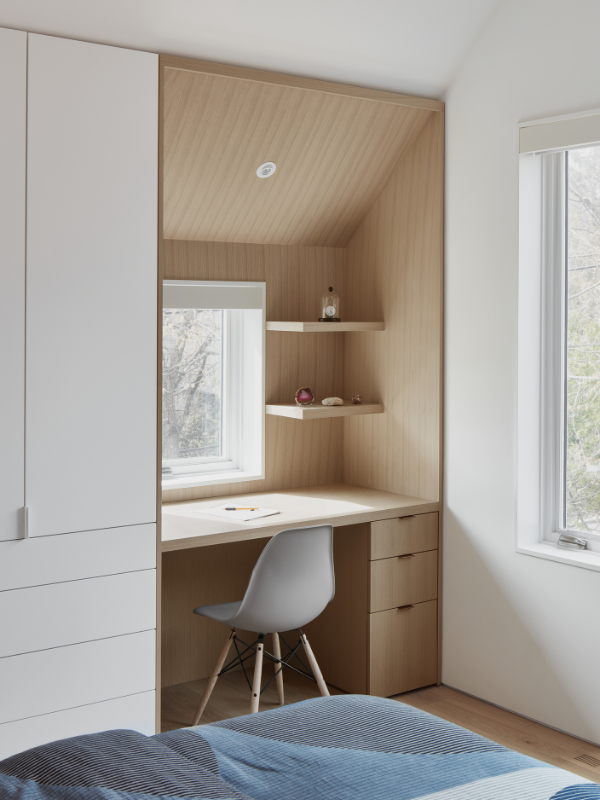 Bennington House by Post Architecture is designed on a beautiful tension: a familiar white farmhouse silhouette paired with a darker, modern counterpart. Tucked into Toronto’s Bennington Heights—“a quiet pocket wrapped in ravines”—it began as a renovation, until the existing structure couldn’t support the homeowners’ goals. The solution was a rebuild on the same footprint: preserving the farmhouse presence and its sense of memory, while opening the door to modern living.
