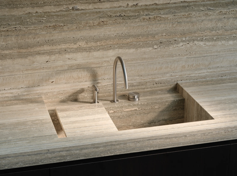 The home’s material palette is layered and tactile. Hand-pressed brick, raw travertine and stainless-steel contrast beautifully. “We searched for materials that evolve with time,” says Jodi.